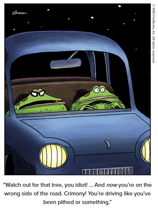 Two frogs in a car argue about driving—ending with the perfect obscure insult: “pithed.”