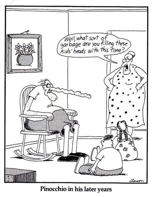 Grown-up Pinocchio telling tall tales to kids, his nose once again giving him away. The man’s still wooden, just in a more jaded way.