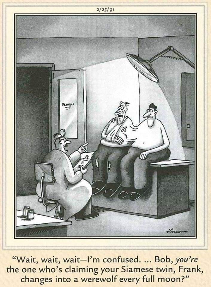 Siamese twins at the doctor’s—one insists the other turns into a werewolf on full moons. It’s so specific you almost believe him.