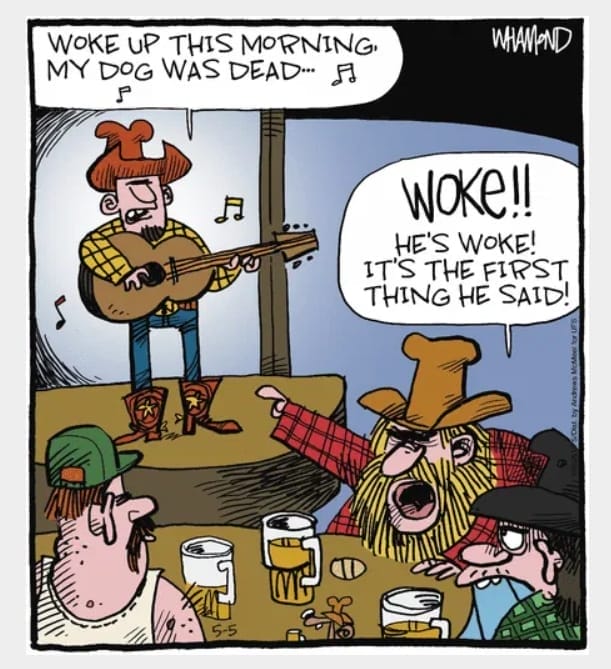 A country singer’s sad song about his dead dog is hilariously misunderstood by a bar patron screaming, “He’s woke!” This cartoon effortlessly parodies both political buzzwords and clueless interpretations.