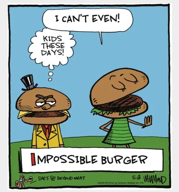 One hamburger scolds the other for “not even,” while muttering “kids these days.” Yep, it’s the Impossible Burger as a generational divide. Only Whamond could turn meatless meat into a metaphor for youth culture.