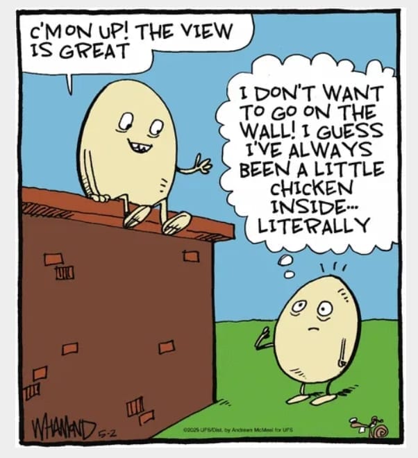 One egg confesses he won’t go on the wall because he’s “always been a little chicken inside.” A yolk-heavy pun? Absolutely. But it’s clever, charming, and worthy of a breakfast spit-take.