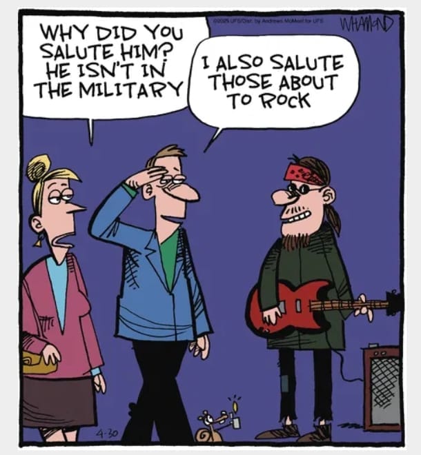 Saluting someone who’s not in the military… but in a band? “I also salute those about to rock” is a rock ‘n’ roll mic drop moment. This one’s for the dad-joke playlist.