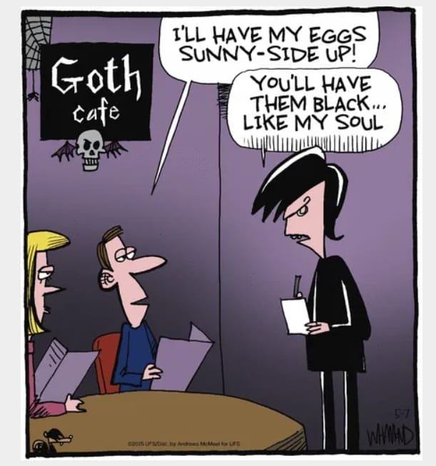 Ordering eggs sunny-side up at the Goth Café? Rookie mistake. The server replies: “You’ll have them black… like my soul.” The delivery is deadpan, the tone is gothic, and the humor is chef’s kiss.
