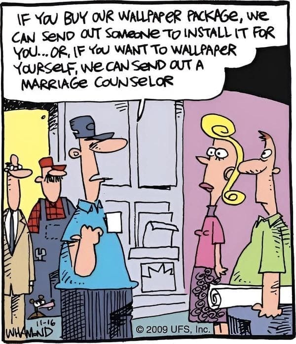 When you buy wallpaper, they offer to install it—or send a marriage counselor if you do it yourself. It’s true: nothing tests love like home renovation. Whamond’s punchline is relatable, sardonic, and scarily spot-on.
