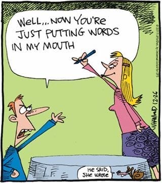 This gender battle of the speech bubble kind is comedy gold. The literal interpretation of the idiom “putting words in my mouth” turns into a punchline of exaggerated wit and visual fun.