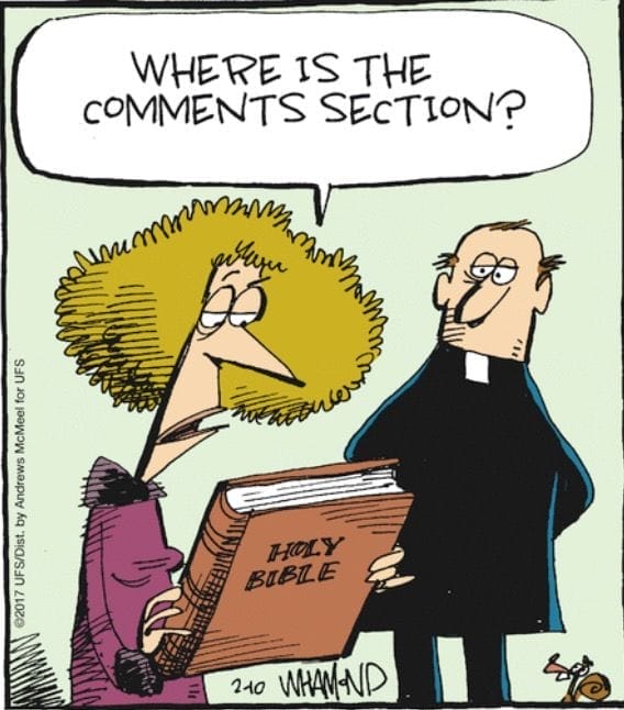 A woman flips through the Bible and asks, “Where’s the comments section?” A beautiful fusion of digital culture and ancient text, this cartoon is a modern meta-joke with theological flair. It’s blasphemous—yet oddly wholesome.