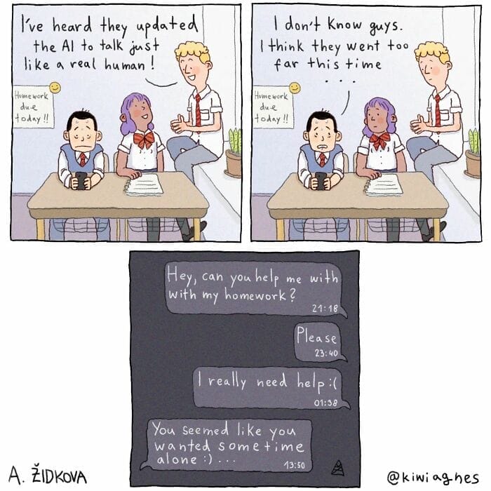 Meet Anežka Židkova, a talented Czech illustrator who’s capturing the internet’s attention with her hilarious and quirky comic series. Known for her clever characters, witty dialogue, and surprising endings, her comics are sure to give you a good laugh. We caught up with Anežka to get an inside look at what inspires her creative process. She told us, I started making comics in my last year of high school while preparing my portfolio for college. Stories were always coming to me, and drawing was something I loved. Comics provide the perfect way to combine storytelling with visuals. As for my humor, I never consciously worked on developing it it just came naturally from my upbringing. My family is really funny, especially my dad. I think Eastern Europeans, in general, have a great sense of humor. However, I’d say my humor is a little gentler compared to the typical Eastern European style. I love sharing my thoughts through humor because when it’s done well, it’s the most effective way to communicate. With her unique perspective and natural comedic flair, Anežka continues to captivate her growing audience. Be sure to follow her work as she keeps creating and sharing more of her amusing, unexpected comics.