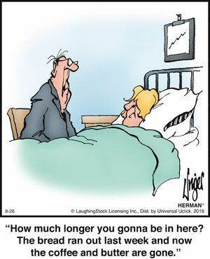 Apparently, hospital visits now come with household rations. This comic might as well be titled “Survivor: The Kitchen Edition.”