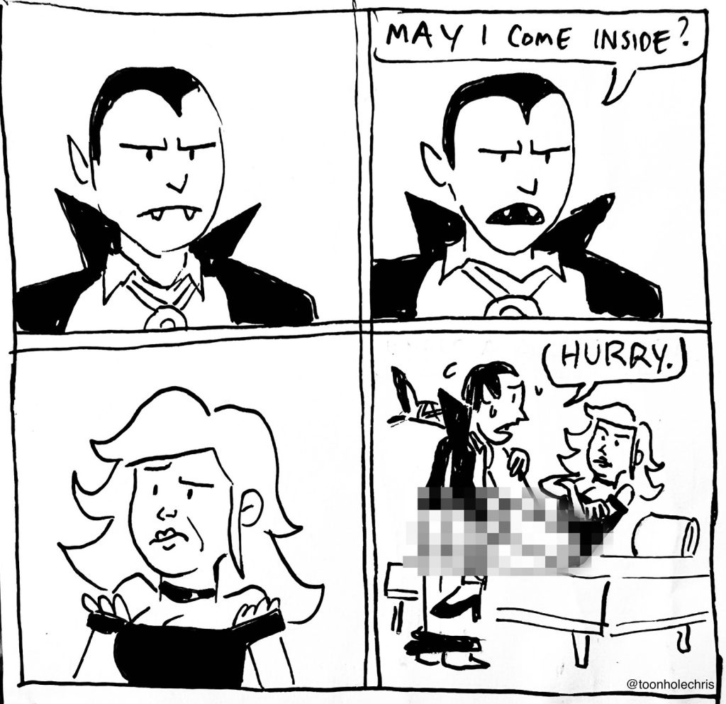 This bold comic strips down a vampire trope and flips it hilariously into… something more adult. Shockingly clever and wonderfully uncomfortable.