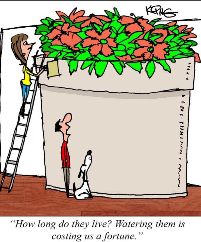 Giant houseplants are all the rage—until you see your water bill. Mark King’s absurdly oversized flowerpot is both an environmental and financial crisis, all in one panel.