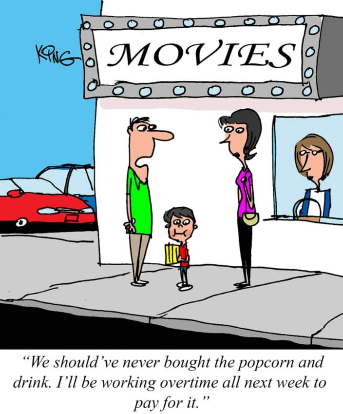 Ever spent more on snacks than on movie tickets? This cartoon’s punchline is every parent’s reality: “I’ll be working overtime all next week to pay for popcorn and a drink.”