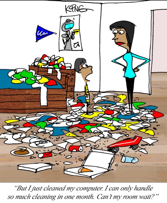 When you’ve just cleaned your computer, how can your mom possibly expect your room to be next? Mark King’s cartoon captures every kid’s logic—and every parent’s pain.