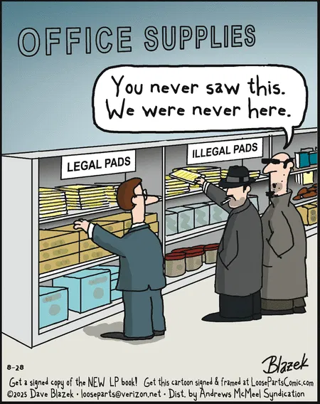Legal vs. illegal pads—Blazek turns stationery into a mobster punchline. Brilliantly absurd.