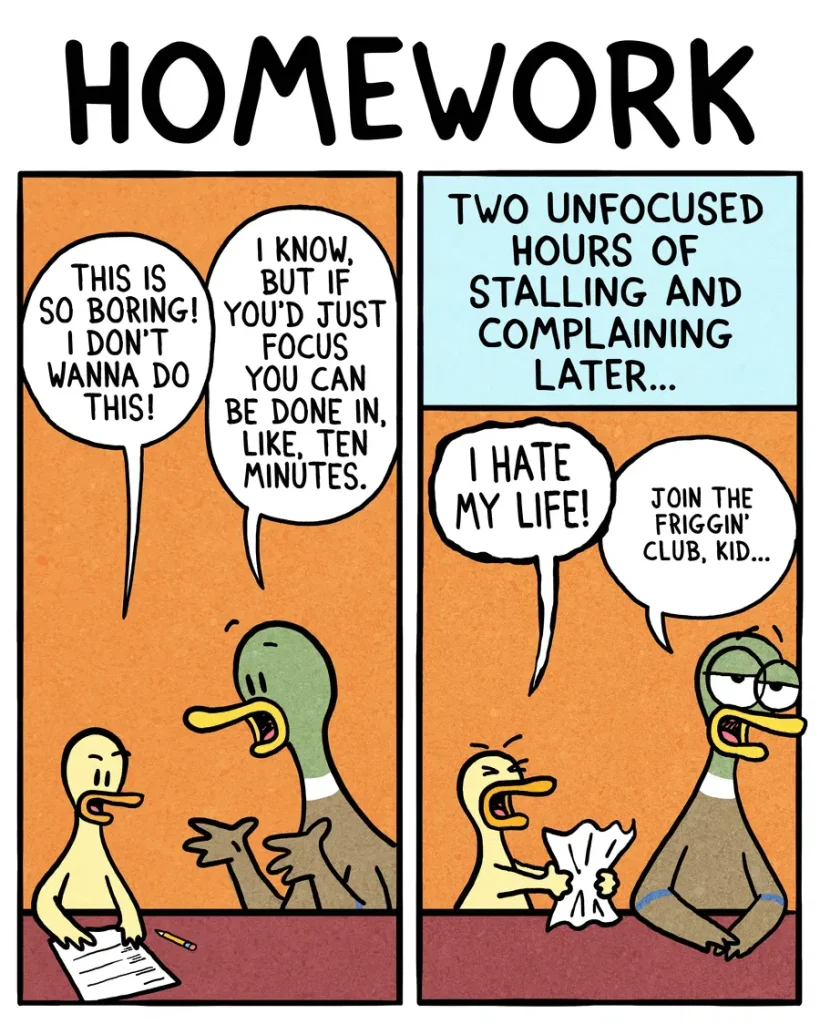 Ten minutes of homework turns into a dramatic saga of “I hate my life!” and eye rolls. The best part? The parent’s deadpan, “Join the friggin’ club, kid.”