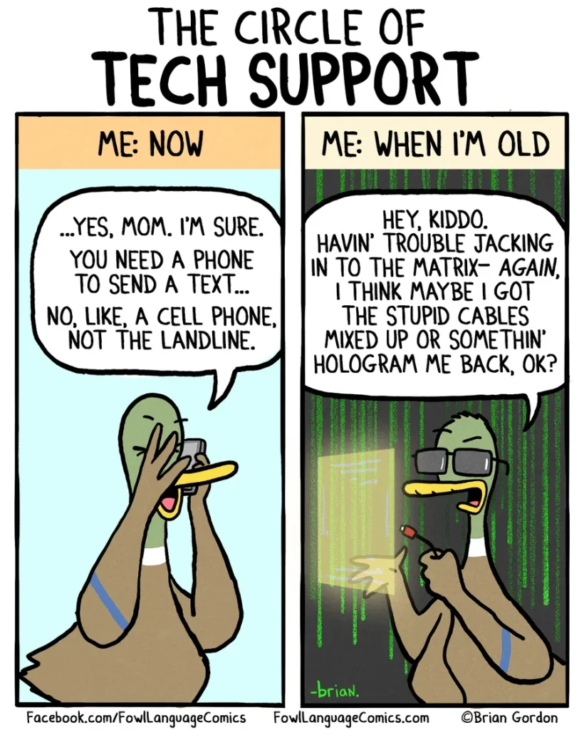 From teaching your mom to text to future hologram troubleshooting, this comic sees the future—and it’s full of generational tech fails.