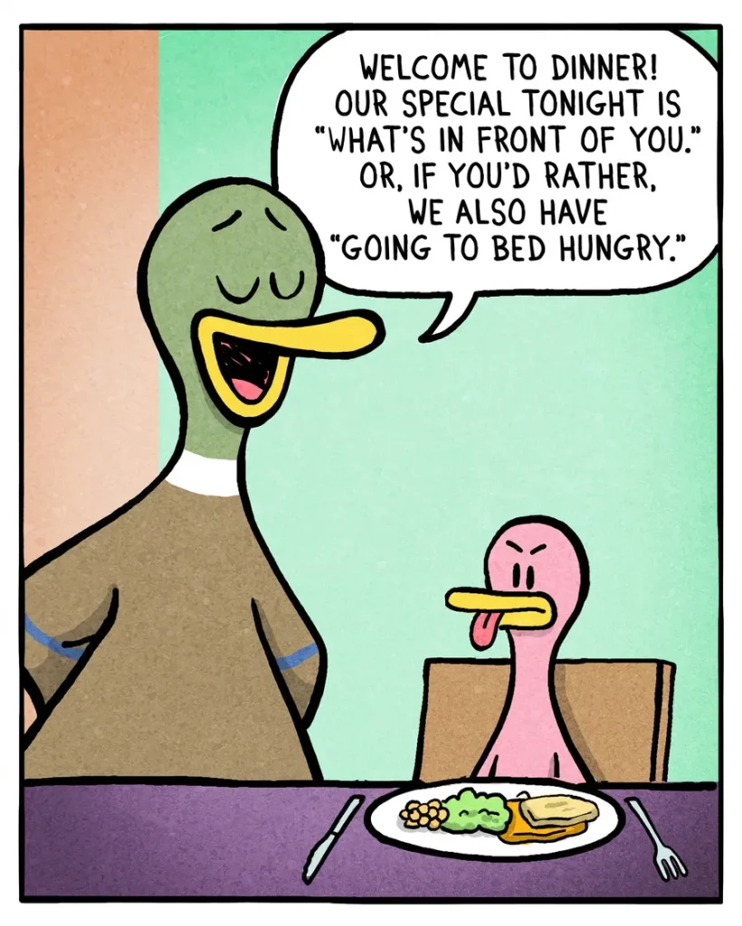 Tonight’s special? Whatever’s on your plate. Or, if you prefer, “going to bed hungry.” The parent’s restaurant-worthy delivery is pure gold.