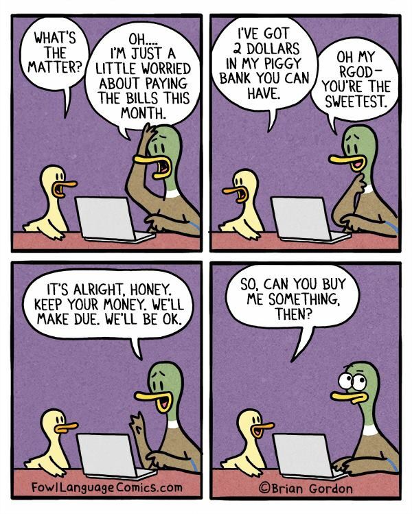 Sweetest gesture: offering $2 from the piggy bank to help with bills. Most accurate punchline: “So, can you buy me something, then?”