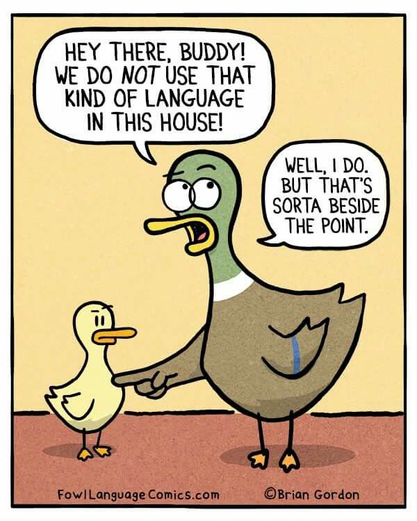 Busted! Every parent’s double standard, immortalized: “We do NOT use that kind of language!” …except, um, sometimes we do. The comic’s side-eye is everything.
