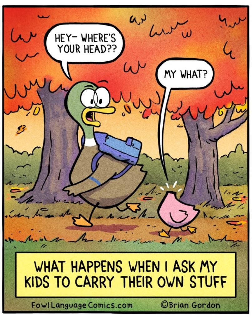 Asking kids to carry their own stuff = instant slapstick. Heads? What heads? This comic turns everyday autumn walks into a masterclass of missing-the-point.