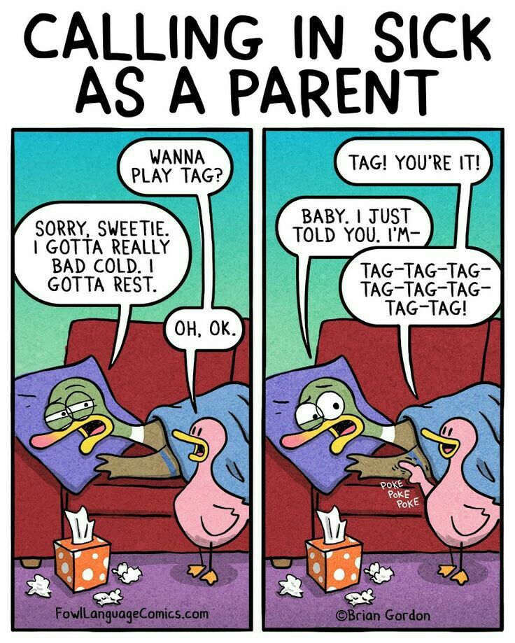You can try to call in sick as a parent, but your boss (a small, enthusiastic duck) doesn’t do PTO. The punchline: relentless tag—sick day or not.