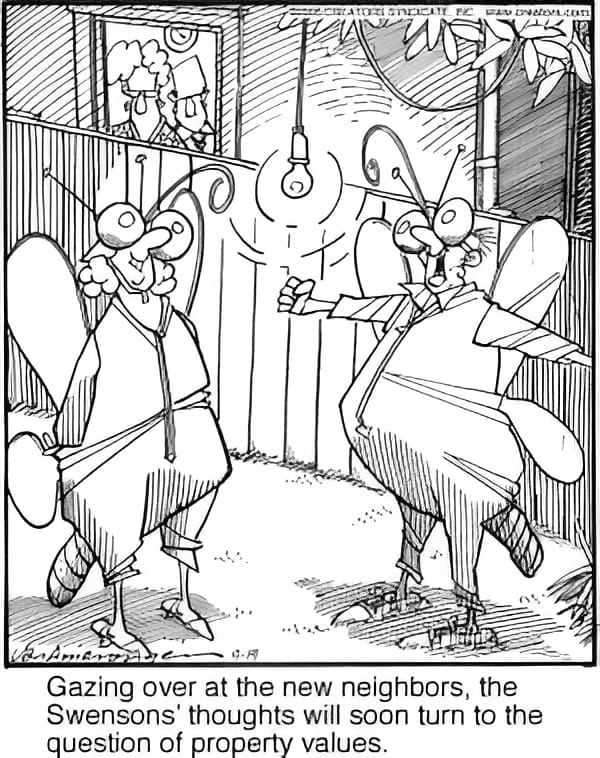 Giant insects in the backyard? Naturally, the Swensons are more concerned about their property value.