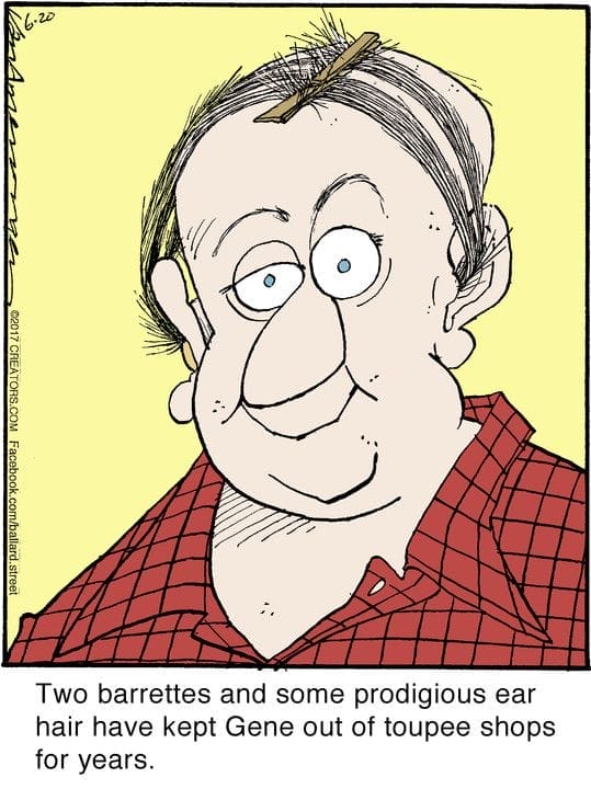 With barrettes and ear hair doubling as a toupee, Gene proves ingenuity trumps vanity.