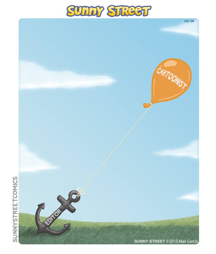 Balloon vs. anchor: the eternal struggle between creative and critical. Garcia visualizes the cartoonist’s plight (and the editor’s drag) with a wink and a nod to anyone who’s ever tried to get a joke past their boss.