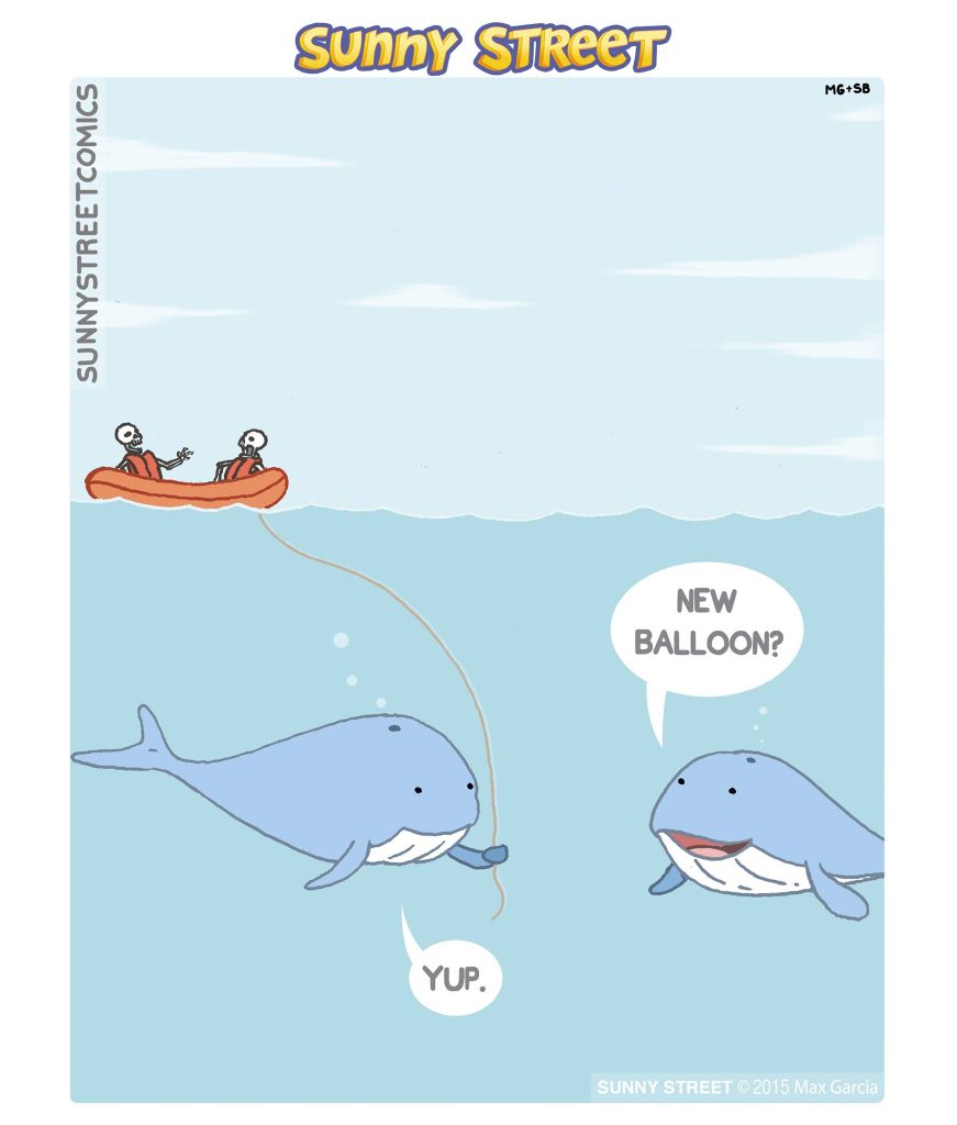 Even the ocean isn’t safe from Sunny Street’s silliness. Two whales, one balloon, and a silent nod to the fate of those boaters above. Minimalist but packed with clever, aquatic irony.
