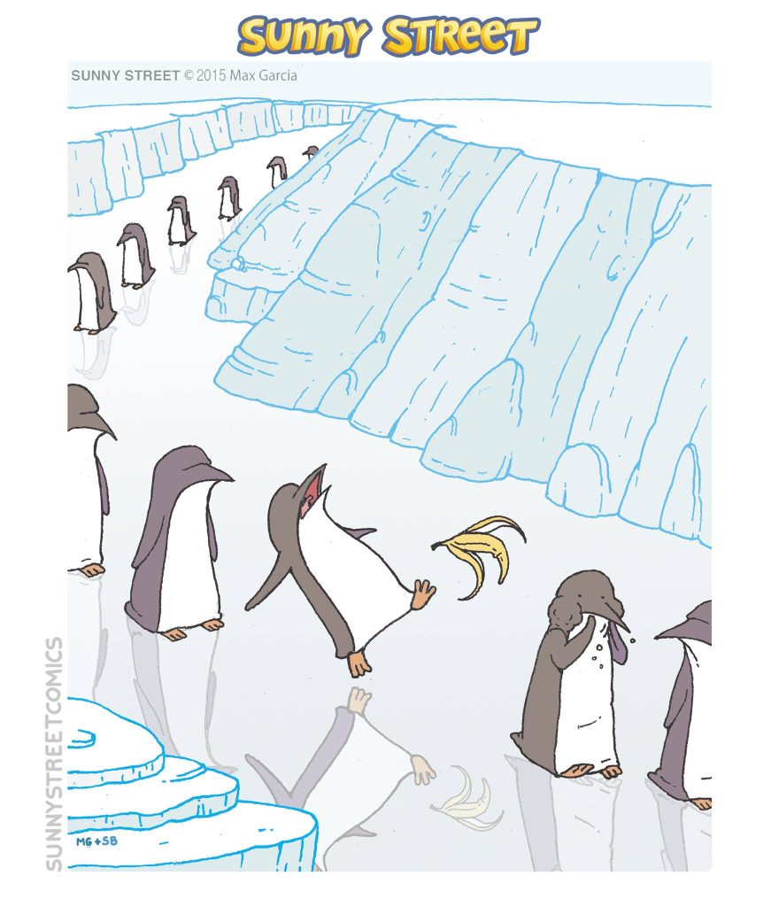 Penguins, ice, and banana peels—what could go wrong? Garcia’s slapstick timing and expressive penguins channel the golden age of funny comic strips.