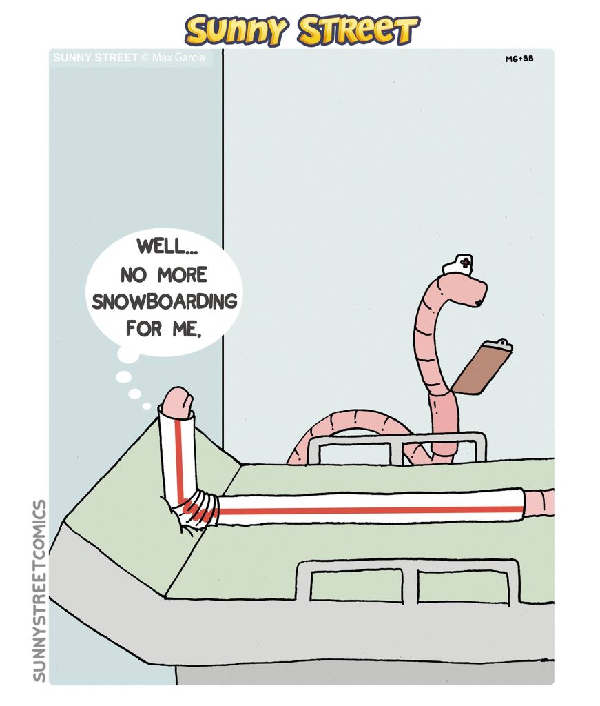 Snowboarding injuries hit different when you’re a worm. Garcia finds new ground for NEW Comic humor by making even earthworms relatable.