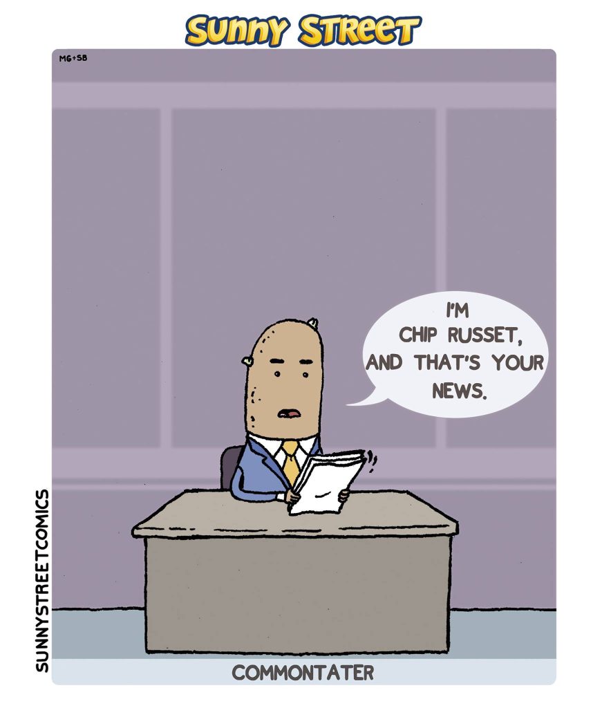 Meet Chip Russet, the news anchor potato. His dry delivery and literal “commentater” joke are prime examples of the droll, everyday humor that makes Sunny Street sing.