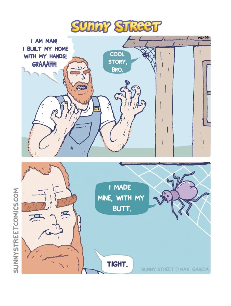 A rugged lumberjack brags about building with his hands…only to be upstaged by a spider spinning a web with its butt. It’s the “tightest” joke in the whole batch.