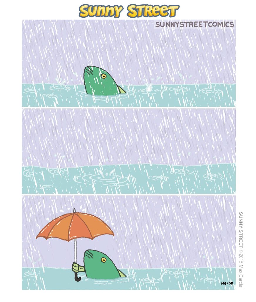 It’s raining. The fish are in the water. So…why not use an umbrella? Garcia’s absurd logic makes perfect sense in the world of Sunny Street, where even fish can be weather warriors.