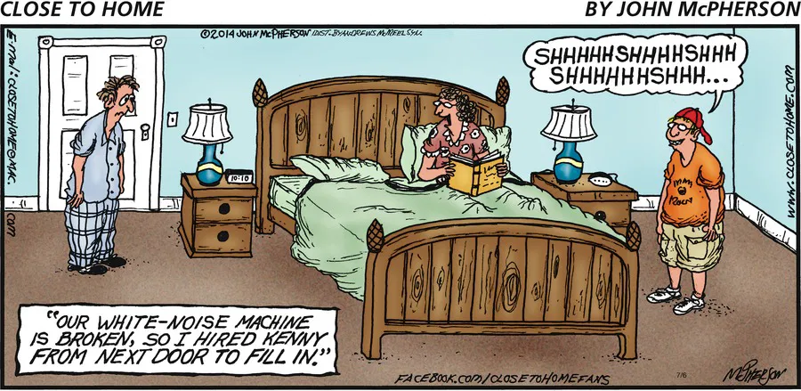 With the white-noise machine broken, a neighbor is hired to stand in and go “shhh, shhh, shhh…” all night. It’s not high-tech, but it is peak cartoon absurdity.