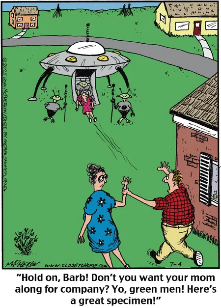 As a UFO beams up a woman, her husband shouts, “Take my mother-in-law too!” Because nothing is more universal—or more ripe for new comics humor—than family dynamics.