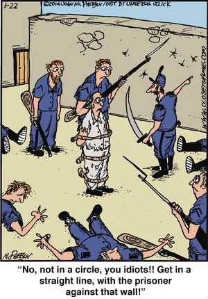 A firing squad is about to make a critical error. “Not in a circle, you idiots! Get in a straight line!” Sometimes, new comics humor is all about the details—especially life-or-death ones.