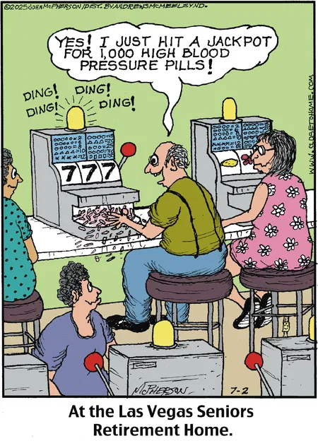 Seniors at the slots rejoice—except the jackpot isn’t cash but 1,000 high blood pressure pills. Only in new comics humor could a windfall come with side effects.