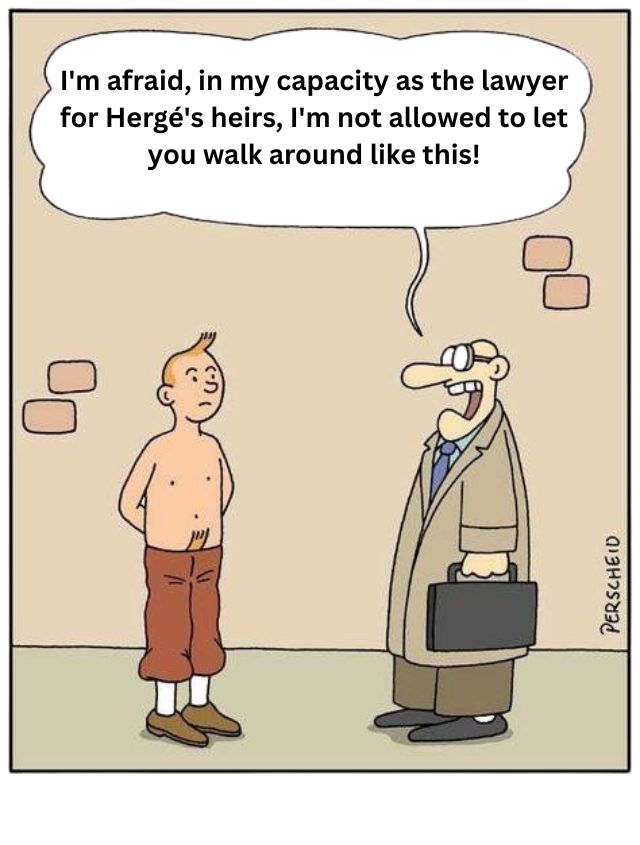 Pop culture references collide with legal anxiety as a familiar character gets shamed for copyright infringement. Only Perscheid could make intellectual property so funny (and slightly scandalous).