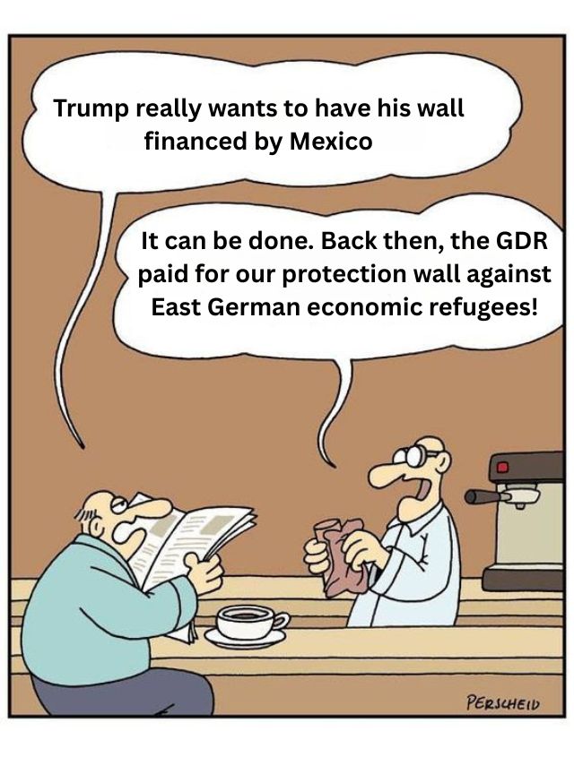 Political satire reigns as Perscheid draws a direct (and hilarious) line between Trump’s wall and Cold War Germany. Absurd history lessons, now with extra caffeine.