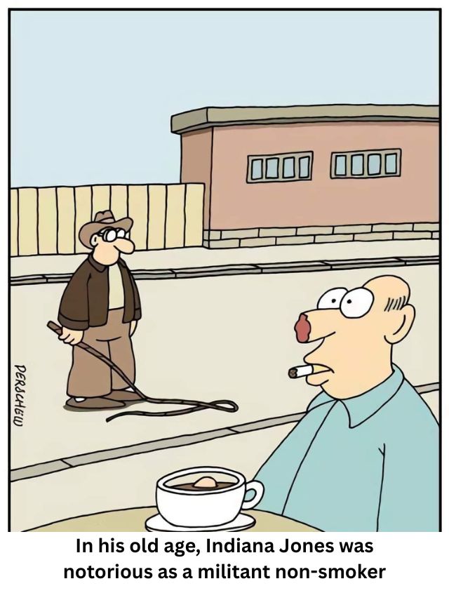 The legendary adventurer has retired—and, apparently, become an anti-smoking zealot. With one whip crack, he’s now policing the local café. Adventure isn’t dead, just repurposed.