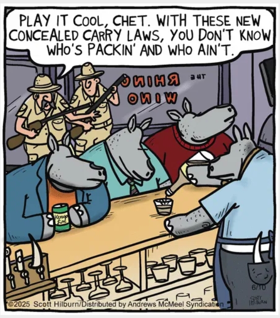 A tense bar scene where rhinos eye each other warily—because who knows who’s packin’? The tension, the tusks, the tip jar—pure dark absurdity.