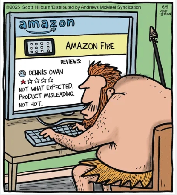 A caveman leaves a 2-star review for “Amazon Fire.” Why? It’s not hot. This prehistoric customer review parody is a brilliant modern twist.