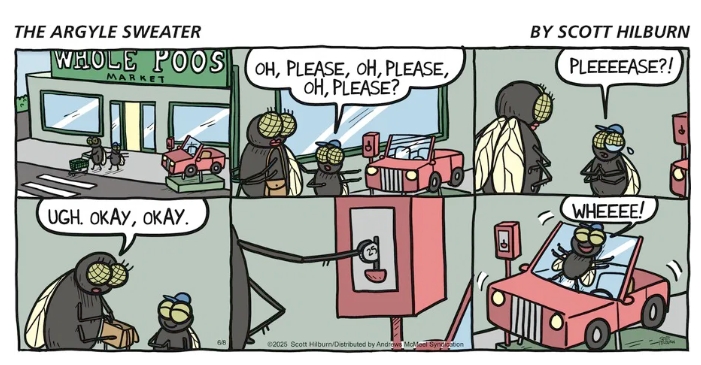 At “Whole Poos,” a little fly begs for a coin-operated ride. The result? “Wheeee!” This one is gross, goofy, and wildly charming in the strangest way.