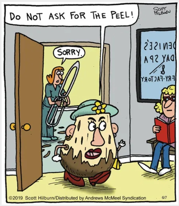 At a day spa, a Potato Head flees in terror—clearly someone asked for the peel. The sheer visual chaos of this spud panic makes it comic gold.