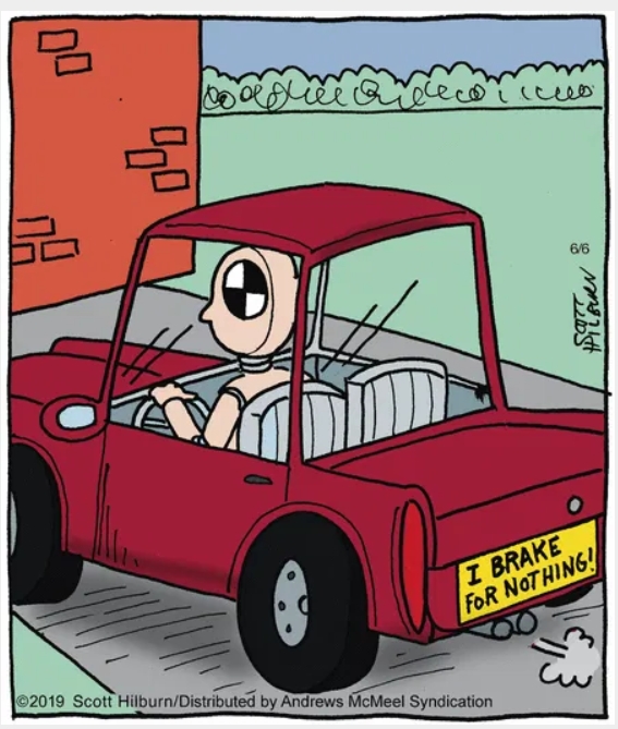 A crash test dummy proudly drives a red convertible with a bumper sticker that reads: “I brake for nothing!” It’s minimal but packed with poetic irony.