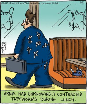 Arnie walks away from a diner with tape trailing out of his suit. Why? Tapeworms, obviously. Visual gross-out meets hilariously subtle body horror.