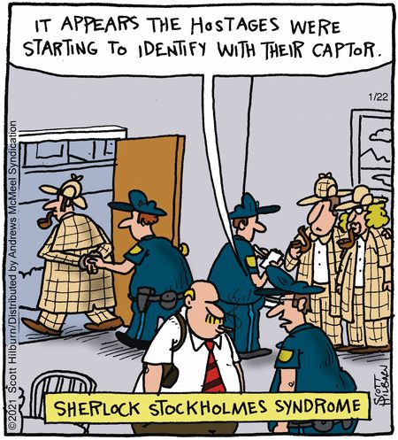 Hostages dressed like Sherlock Holmes are escorted out by confused police. It’s not a fashion trend—it’s a psychiatric punchline with style.