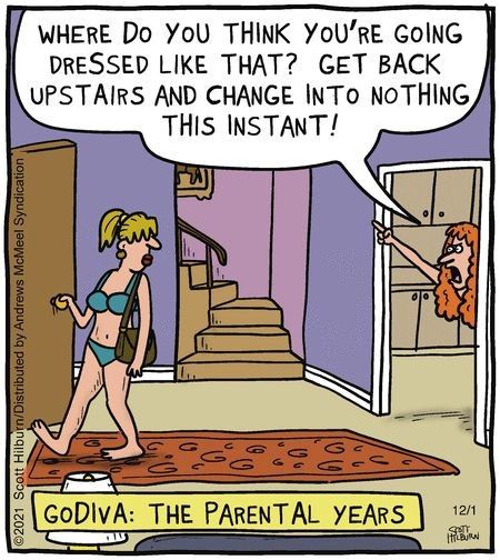Lady Godiva’s daughter is headed out in a bikini. Her mom screams, “Get upstairs and change into nothing!” And just like that, parental hypocrisy is roasted to perfection.