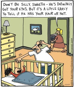 Dad coos at a baby: “He’s got your eyes… but not sure about the hair yet.” The joke? The baby’s bald, and so is Dad. Dark humor in diapers.